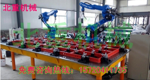 機器人焊接平臺的承載能力高,鋼性穩定,它的五個面均加工有規則的孔,并刻有網線。焊接平臺可方便地延伸和擴展,組合。經擴展的標準臺面可模塊化的定位和夾緊直接連接在一起。在安裝、調整和定位工件過程將柔性三維組合焊接工裝系統的通用功能展示的淋漓盡致,尤其在了大型工件方面的應用上。